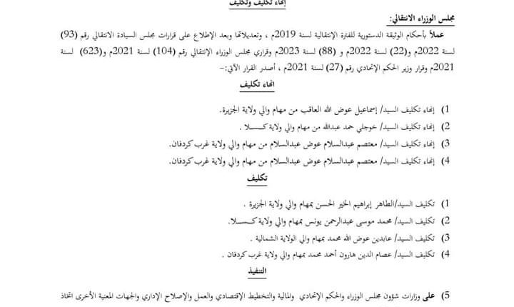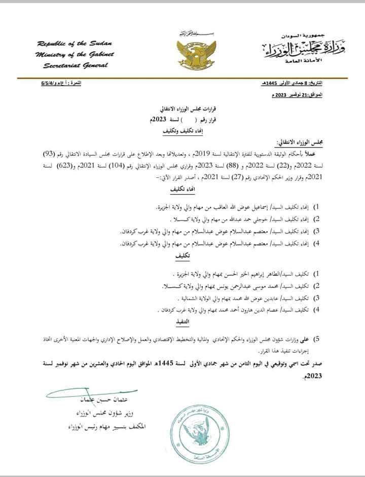 *١- إنهاء تكليف/ السيد اسماعيل عوض الله العاقب من مهام والي ولاية الجزيرة*