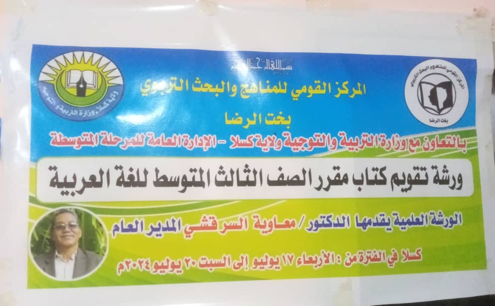 ترأس د/ معاوية السر قشي.. مدير عام المركز القومي للمناهج والبحث التربوي بخت الرضا ورشة تقويم كتاب مقرر الصف الثالث المتوسط للغة العربية. بحضور استاذ/ صلاح بابكر مدير إدارة المرحلة المتوسطة ولاية كسلا وخبراء وزارة التربية كسلا والمركز .