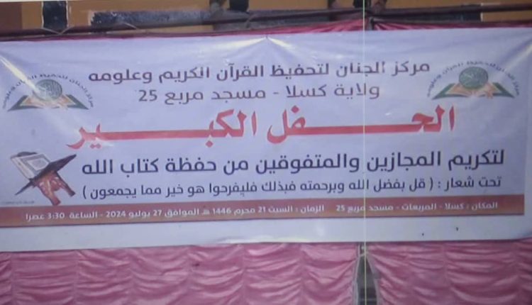 شهد الاستاذ/ ماهر الحسين مدير عام وزارة التربية والتوجيه الوزير المكلف ممثل والى ولاية كسلا .. الاحتفال الكبير لتكريم المجازين المتفوقين من حفظة كتاب الله بمركز الجنان لتحفيظ القران الكريم وعلومه بمسجد المربعات مربع ٢٥ .. بحضور وزير الشئؤن الاجتماعية ووزير الشباب والرياضة وممثلى جامعة القران الكريم وتأصيل العلوم وعدد مقدر من الشيوخ والاسر آباء وأمهات .