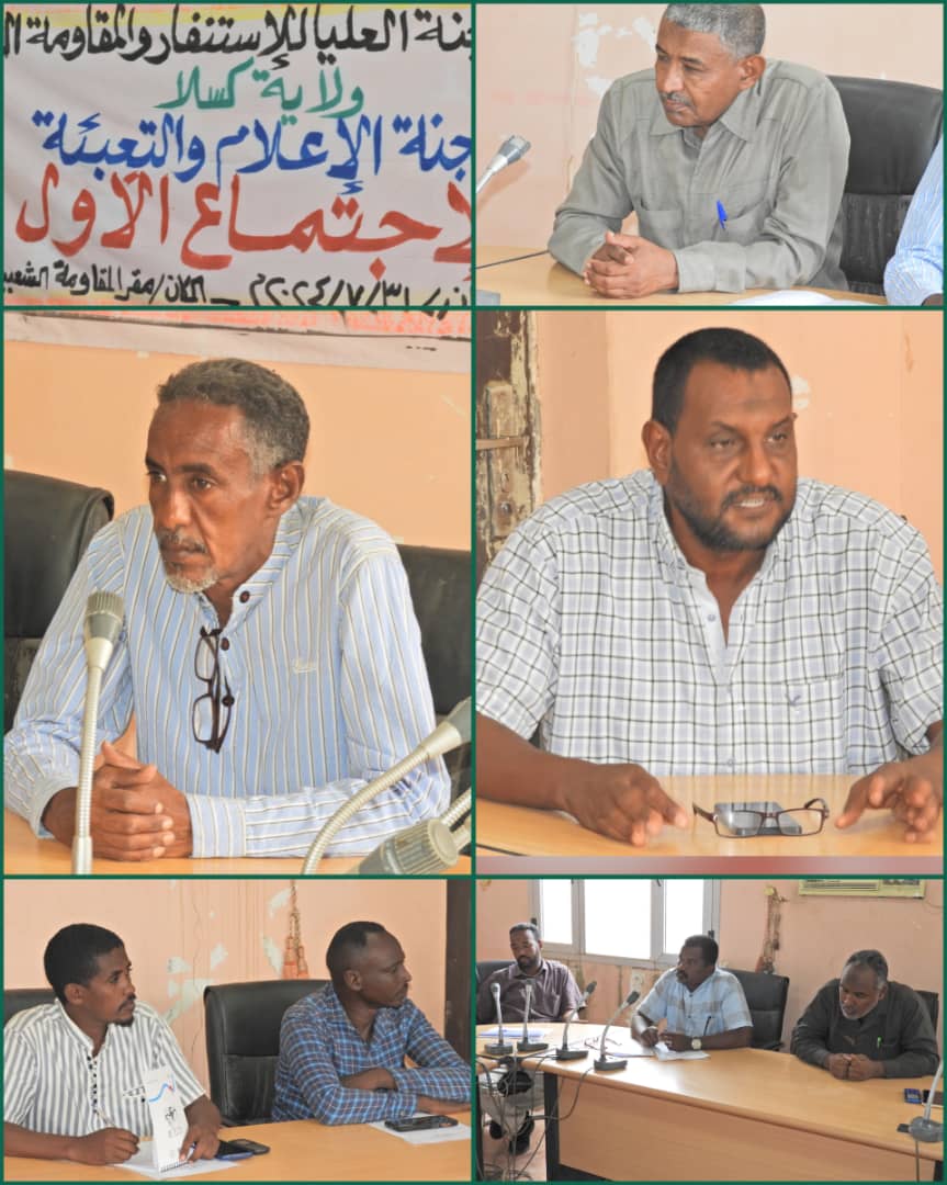 *انعقد الاجتماع الأول للجنة الاعلام والتعبئة العامة باللجنة العليا للاستنفار والمقاومة الشعبية بولاية كسلا في مقرها الرئيس بمدينة كسلا وذلك بحضور رئيس اللجنة العليا للاستنفار والمقاومة الشعبية بولاية كسلا سعادة اللواء ركن معاش مهندس بحري موسى أحمد موسى والذي قدم عددآ من التوجيهات والملاحظات في خطة اللجنة مشيرآ الي ضرورة استصحاب جميع المتغيرات السياسية والأمنية والمجتمعية وخلق عمل قوي لدعم جهود القوات المسلحة مبينآ ان الجهد على لجنة الإعلام والتعبئة العامة هو الأكبر خاصة مع استخدام العدو لسلاح الإعلام بصورة مكثفة من جهته قدم رئيس لجنة الإعلام والتعبئة العامة الاستاذ خالد أكد عددآ من الأنشطة في الخطة العامة وملامح من البرامج التي سوف تقدم في ماتبقى من هذا العام وطالب اعضاء لجنته بالاجتهاد الشديد لاستخدام سلاح الإعلام تأثيرآ أقوى لهزيمة المليشيا المتمردة وفضح اكاذيبهم ومؤمراتهم* .