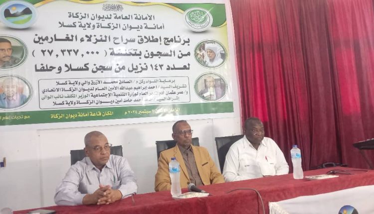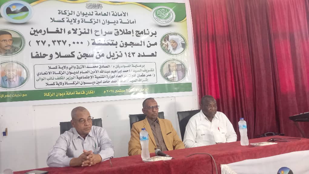 جاء ذلك لدى مخاطبتة اليوم بقاعه ديوان الزكاة بكسلا برنامج اطلاق سراح النزلاء الغارمين من بتكلفة ٢٧مليون و٣٣٧الف جنيه لعدد١٤٣نزيلا من سجن (كسلا وحلفا الجديده) بحضور الامين العام لامانة ديوان الزكاة الاتحادي و رئيس الجهاز القضائي بالولاية وعددمن القيادات الأمنية وقيادات ديوان الزكاة الاتحادي والولائي