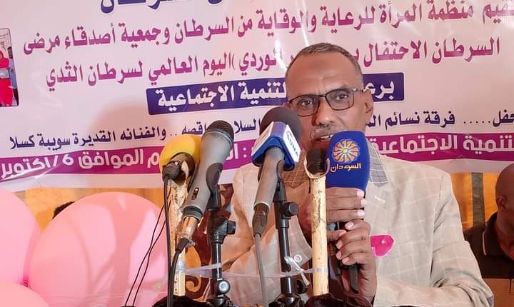 واشاد نائب والي كسلا الأستاذ عمر عثمان بمبادرة منظمة المرأة للرعاية والوقاية لاقامتها لفعاليات الإحتفال باليوم العالمي لسرطان الثدي واختيارها مقّر وزارة التنمية الإجتماعية ، مؤكداً أن الإحتفال بهذا اليوم يمثل واحدة من أنشطة التوعية لمكافحة سرطان الثدي وسط الفتيات والمجتمع بجانب تعزيز الجانب النفسي و المعنوي لدى المصابات ، مضيفاً أن ذلك يحتاج إلى جهد كبير من حكومة و مجتمع الولاية لتجاوز مخاطره والعلاج منه ، مؤكدا وقوف حكومة ولاية كسلا مع كل المنظمات الساندة للصحة باعتبار ان الصحة واحدة من الأولويات التي تأتي بعد الأمن مباشرة .