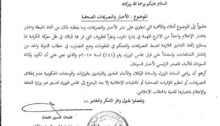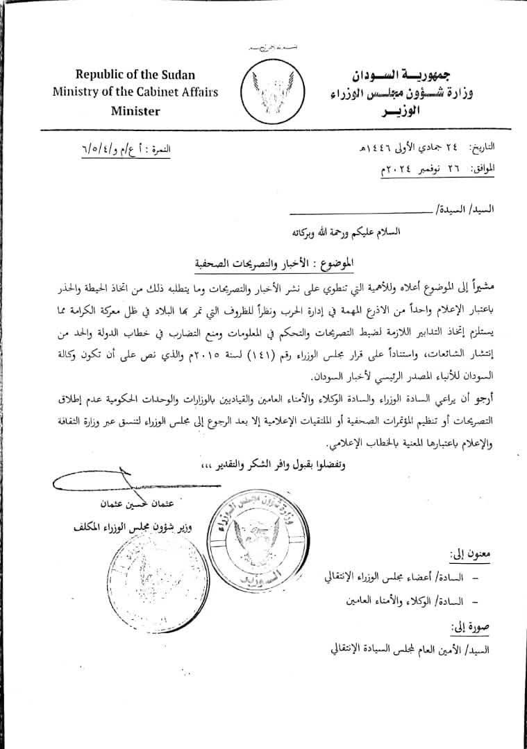 وجه مجلس الوزراء الإنتقالي السادة الوزراء ،والسادة الوكلاء والأمناء العامين والقياديين بالوزارات والوحدات الحكومية بالرجوع إلى المجلس عبر وزارة الثقافة والإعلام بإعتبارها المعنية بالخطاب الإعلامي فيما يتعلق بإطلاق التصريحات أو تنظيم اللقاءات الصحفية أو الملتقيات الإعلامية .