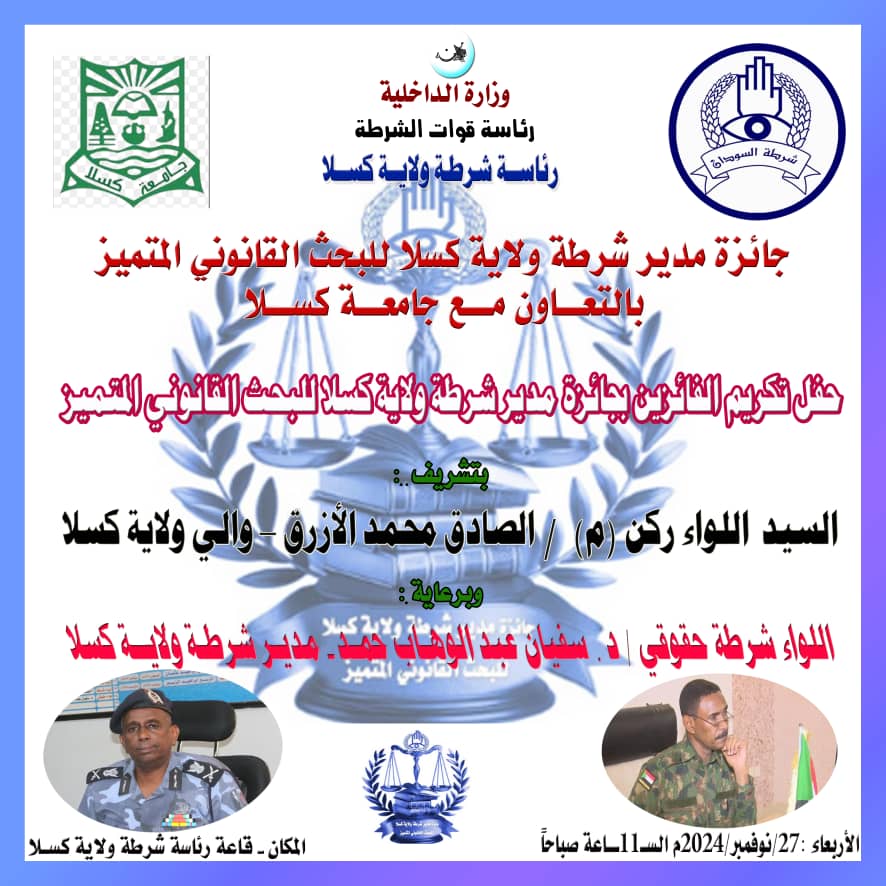 *أقامت شرطة ولاية كسلا بالتعاون مع جامعة كسلا بقاعة الشرطة حفل تكريم الفائزين بجائزة مدير شرطة ولاية كسلا للبحث القانوني المتميز بحضور الخلوق والي ولاية كسلا بالإنابة الأستاذ عمر عثمان ومدير شرطة ولاية كسلا اللواء شرطة حقوقي دكتور سفيان عبد الوهاب وبروفيسور أماني عبد المعروف مديرة جامعة كسلا وعدد من القانونيين وقادة الشرطة*