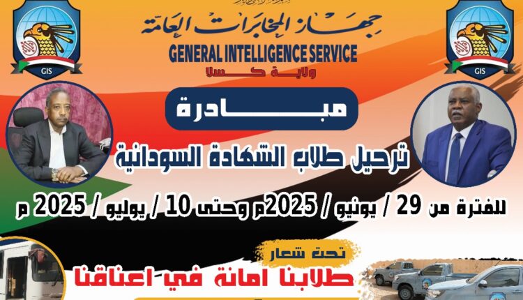 أطلق جهاز الأمن والمخابرات العامة بولاية كسلا مبادرة ترحيل طلاب الشهادة السودانية للعام 2025، والتي تنطلق اعتبارًا من يوم الأحد الموافق 29 يونيو وتستمر حتى 10 يوليو المقبل، تحت شعار “طلابنا أمانة في أعناقنا”.