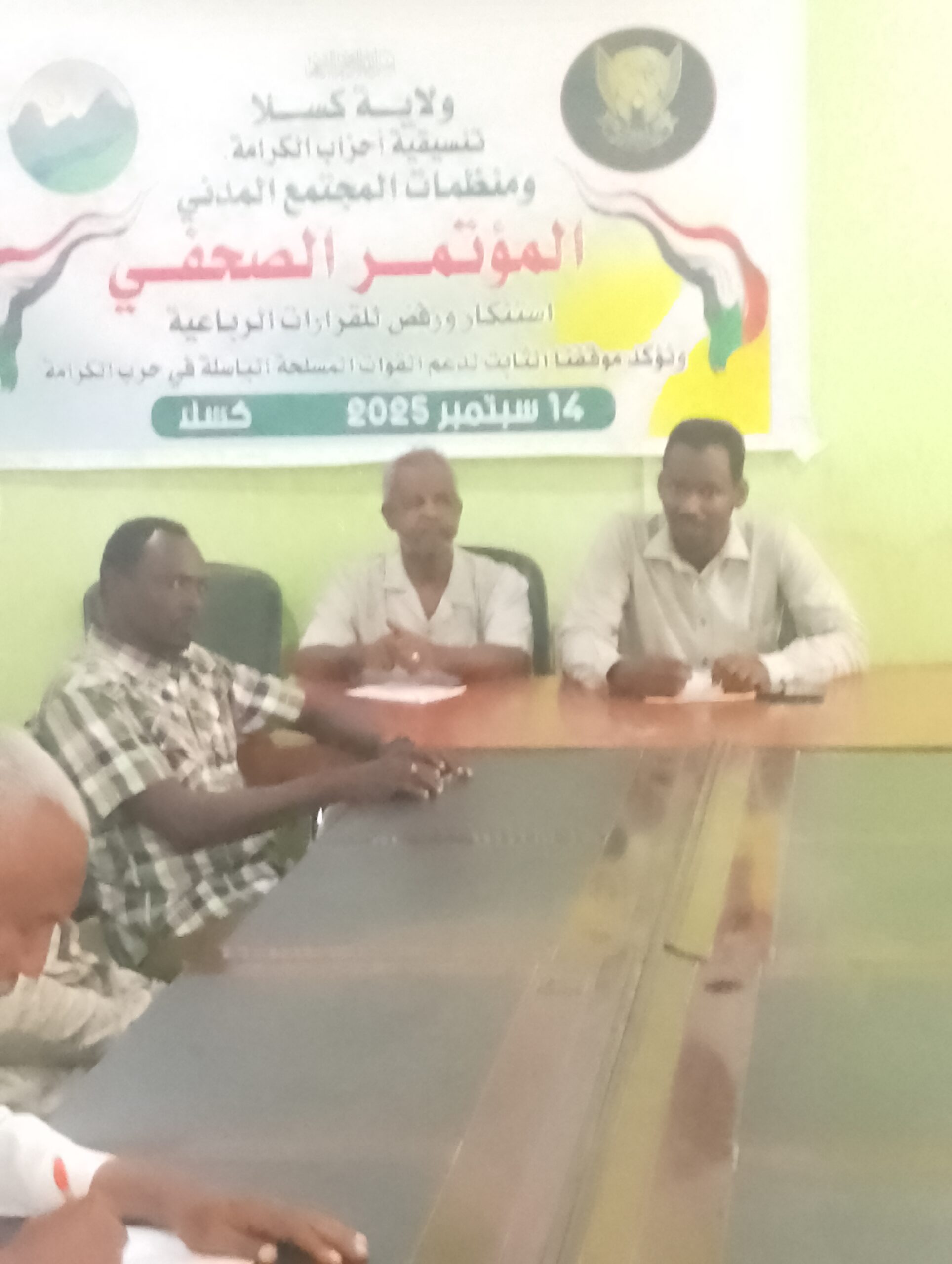 عقدت تنسيقية أحزاب الكرامة ومنظمات المجتمع المدني بولاية كسلا اليوم مؤتمراً صحفياً بقاعة وزارة الثقافة والإعلام، أعلنت من خلاله عن رفضها القاطع واستنكارها الشديد للقرارات الرباعية الأخيرة، مؤكدةً تمسكها بموقفها الثابت في دعم القوات المسلحة السودانية في معركة حرب الكرامة التي تخوضها دفاعاً عن سيادة البلاد ووحدتها وسلامة أراضيها.
