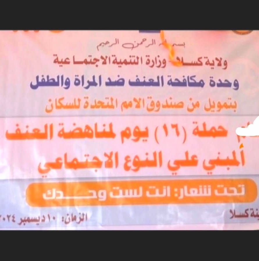 فقدأكملت وحدة مكافحة العنف ضد المرأة بوزارة التنمية الاجتماعية بولاية كسلا كافة الترتيبات لانطلاق حملة (16 يوماً لمناهضة العنف ضد المرأة والفتيات)، بمشاركة المنظمات الدولية والطوعية ومنظمات المجتمع المدني العاملة في مجال الحماية، إلى جانب الجهات ذات الصلة، في خطوة تعكس التزام الولاية بتمكين النساء وتعزيز حقوقهن.