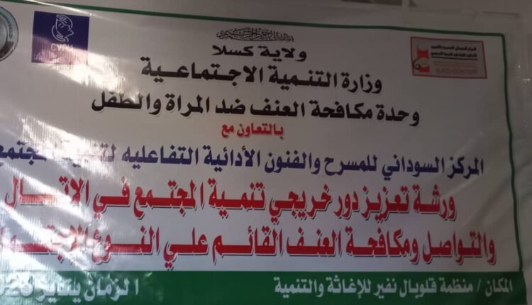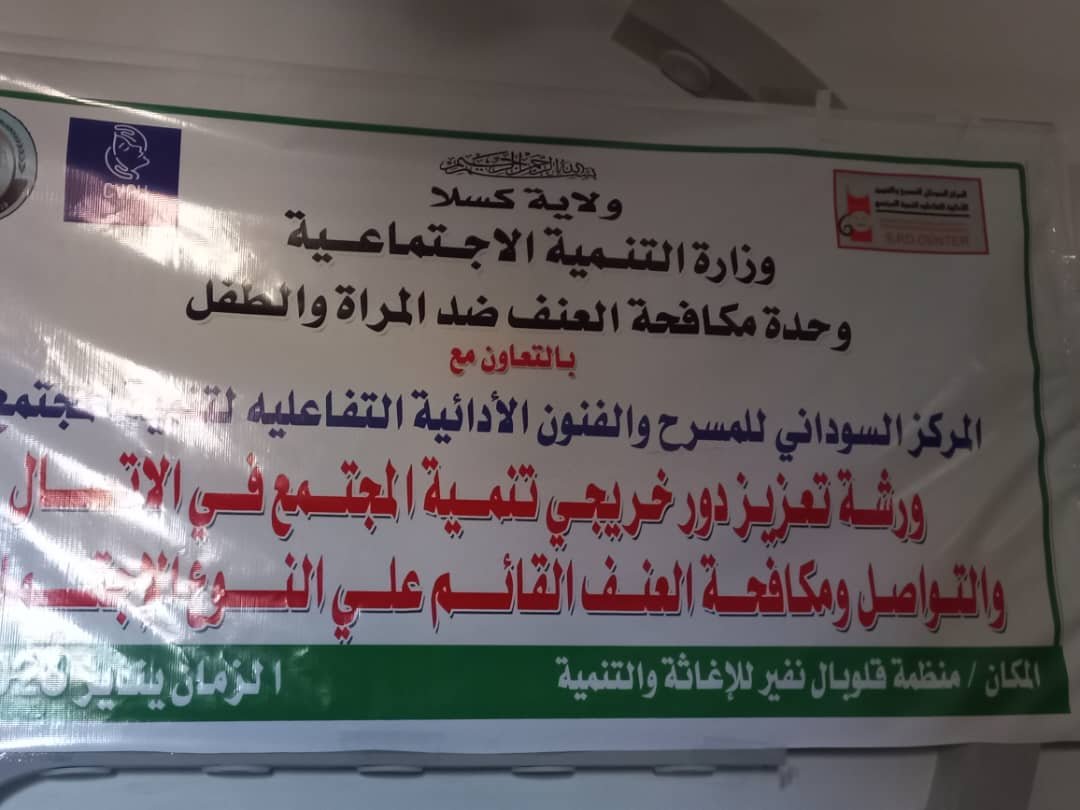 في إطار الجهود الرامية لتعزيز دور الشباب في قضايا التنمية المجتمعية، نفذ المركز السوداني للمسرح والفنون الأدائيه التفاعليه بالشراكه مع وحدة مكافحة العنف ضد المرأة والطفل و منظمة قوبال نفير للاغاثه والتنمية ورشة تدريبية حول تعزيز دور خريجي تنمية المجتمع في الاتصال والتواصل ومكافحة العنف القائم على النوع الاجتماعي ، بمشاركة ٣٥ متطوع ومتطوعه من خريجي تنمية المجتمع والناشطين في العمل المجتمعي.